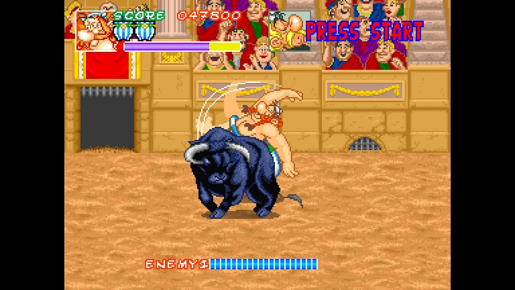 Al final, mi pasión por el Imperio Romano me ha llevado a decantarme por Asterix y Obelix, el clásico de Konami que vio la luz en 1992 para los arcade. ¿Qué os parece si visitamos las diferentes provincias imperiales a través de este videojuego? La experiencia ha sido maravillosa, ya que daba la sensación de que estaba leyendo un cómic de René Goscinny y Albert Uderzo: escenarios coloridos, mamporros por todos los lados, golpes, muecas graciosísimas, animaciones super supercachondas...